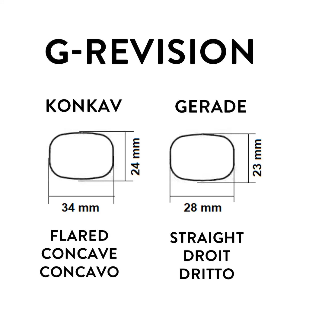 G-Revision steht für die neue Griffform die Nittaku den Hölzern der Acoustic Serie spendiert hat. Die neuen Griffe sind etwas ovaler und kräftiger als die Griffe der "normalen" Acoustic Serie. Die Blattflügel haben einen etwas schmaleren Winkel, dadurch kann man tiefer in das Holz reingreifen.