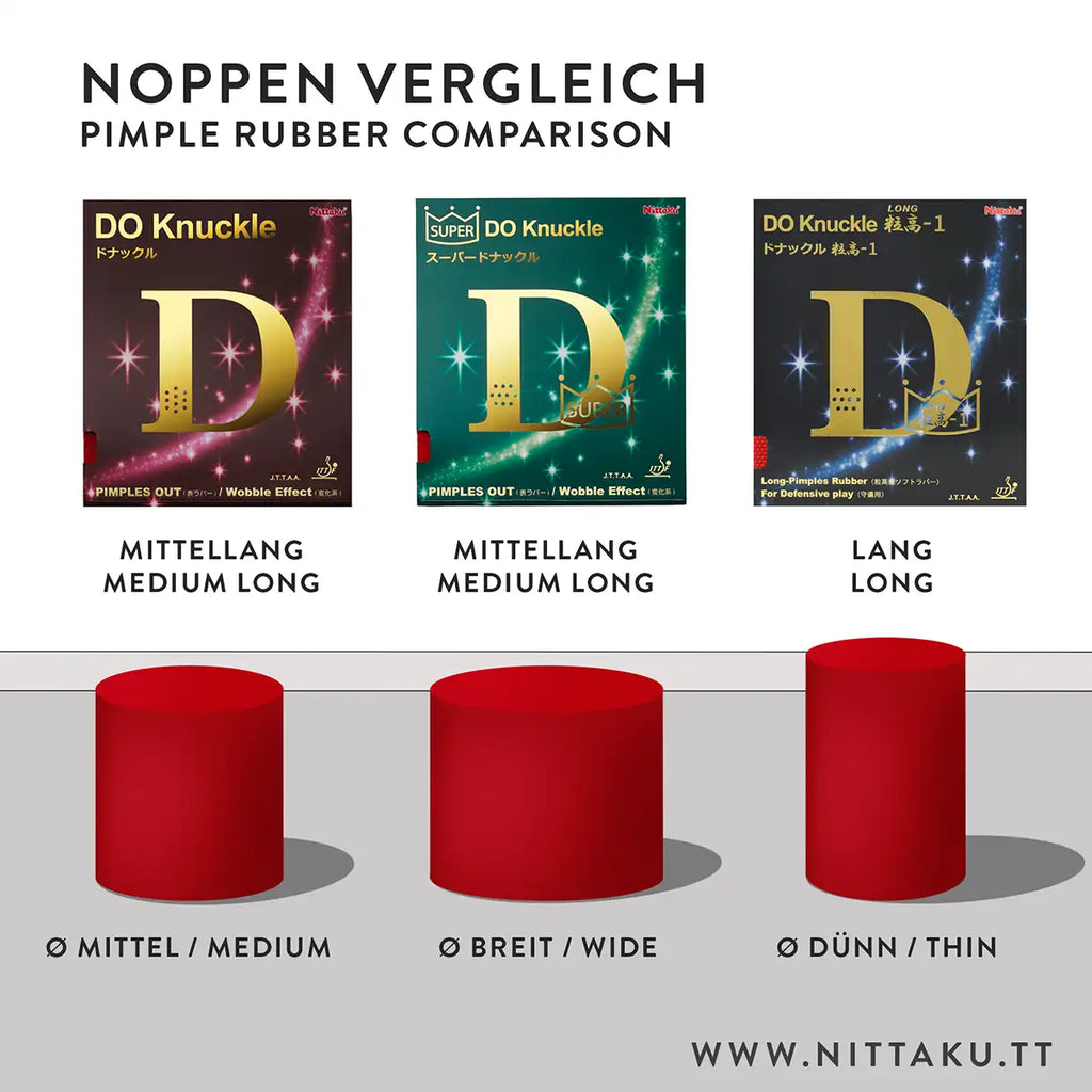 Der DO KNUCKLE hat etwas weniger Stör-Effekt als der SUPER DO KNUCKLE. Beide Beläge haben die gleiche Noppenlänge, allerdings hat der SUPER DO KNUCKLE einen größeren Noppen-Durchmesser. Dadurch wird der Stör-Effekt maximiert.